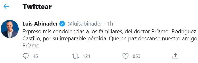 Abinader, en un breve escrito en su cuenta personal de Twitter, escribió: «Que en paz descanse nuestro amigo Príamo».