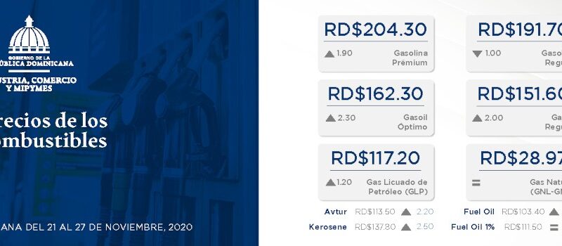 Por lo anterior, para la semana del 21 al 27 de noviembre, el MICM ha dispuesto que la gasolina regular se venda a 191.70, un peso menos que la semana pasada; la premium a 204.30, para un incremento de 1.90 pesos por galón; mientras que el galón de gasoil regular subirá 2.00, para cotizarse a 151.60, y el Optimo a 162.30, subiendo 2.30 pesos por galón. Por último, el gas licuado se dispensará a 117.20, incrementando 1.20 pesos por galón.