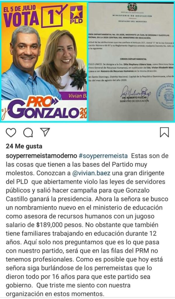 En la cuenta oficial de Instagram de “Soy Perremeista Moderno”, manifestaron su descontento con el actual ministro de Educación, Roberto Fulcar por dejar a Báez, ahora como asesora de ese ministerio.