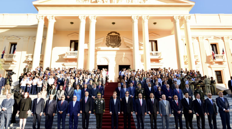 El presidente Danilo Medina, acompañado de ministros, directores generales y otros empleados del Gobierno, rindió un solemne tributo a la Bandera Dominicana, durante una ceremonia realizada en la explanada frontal del Palacio Nacional.